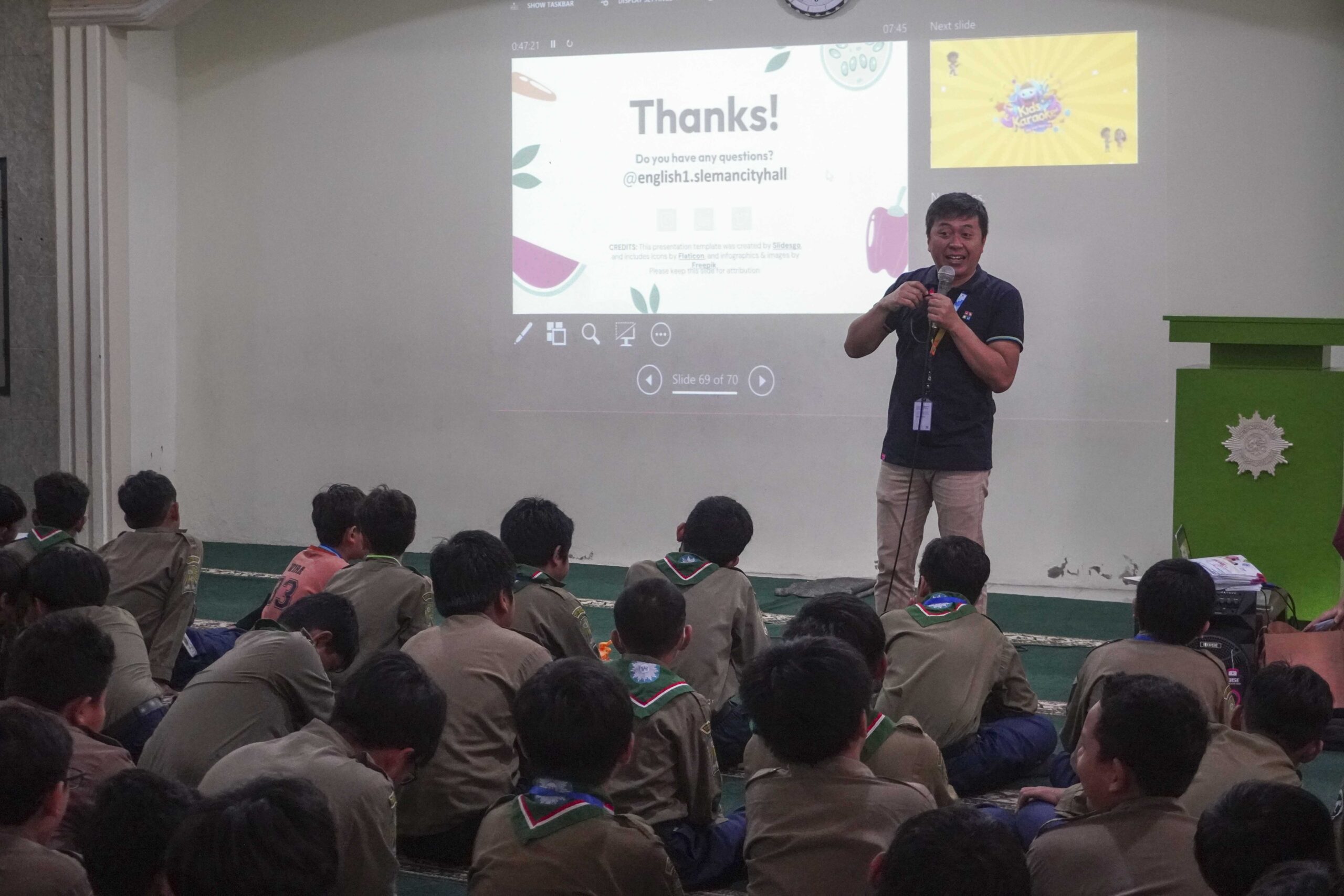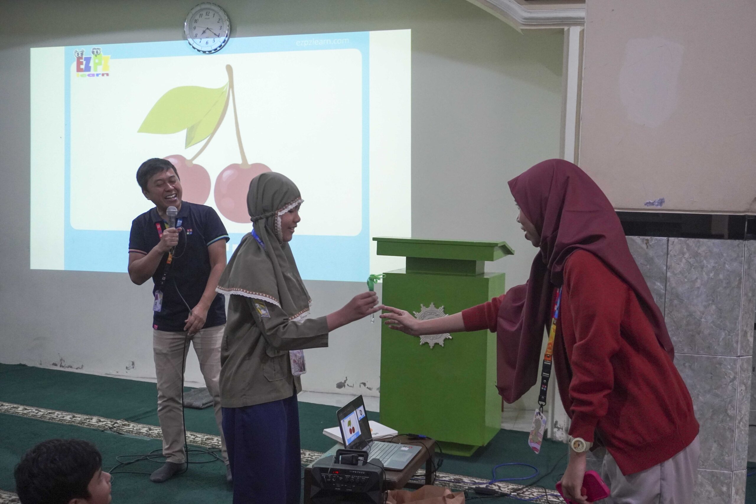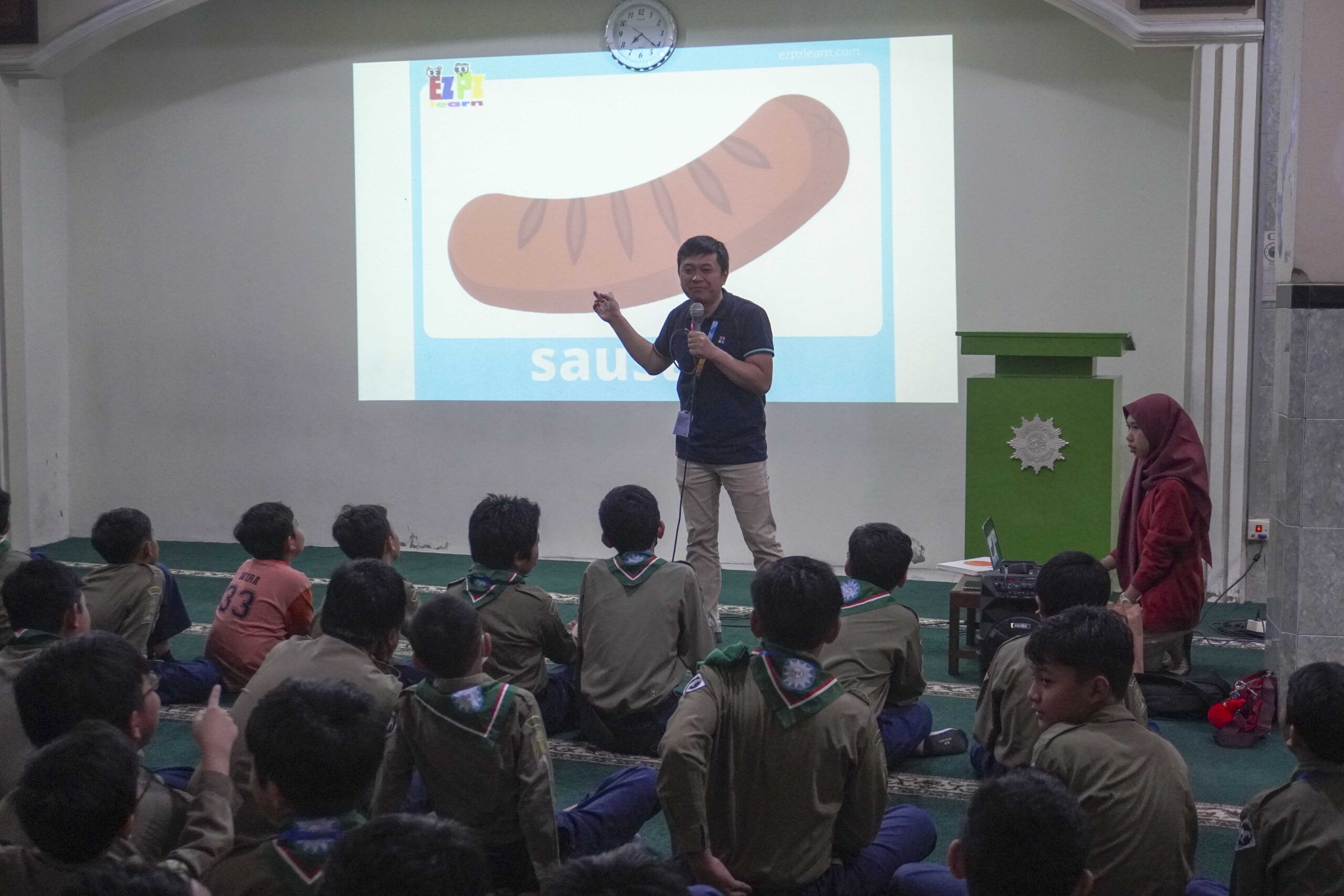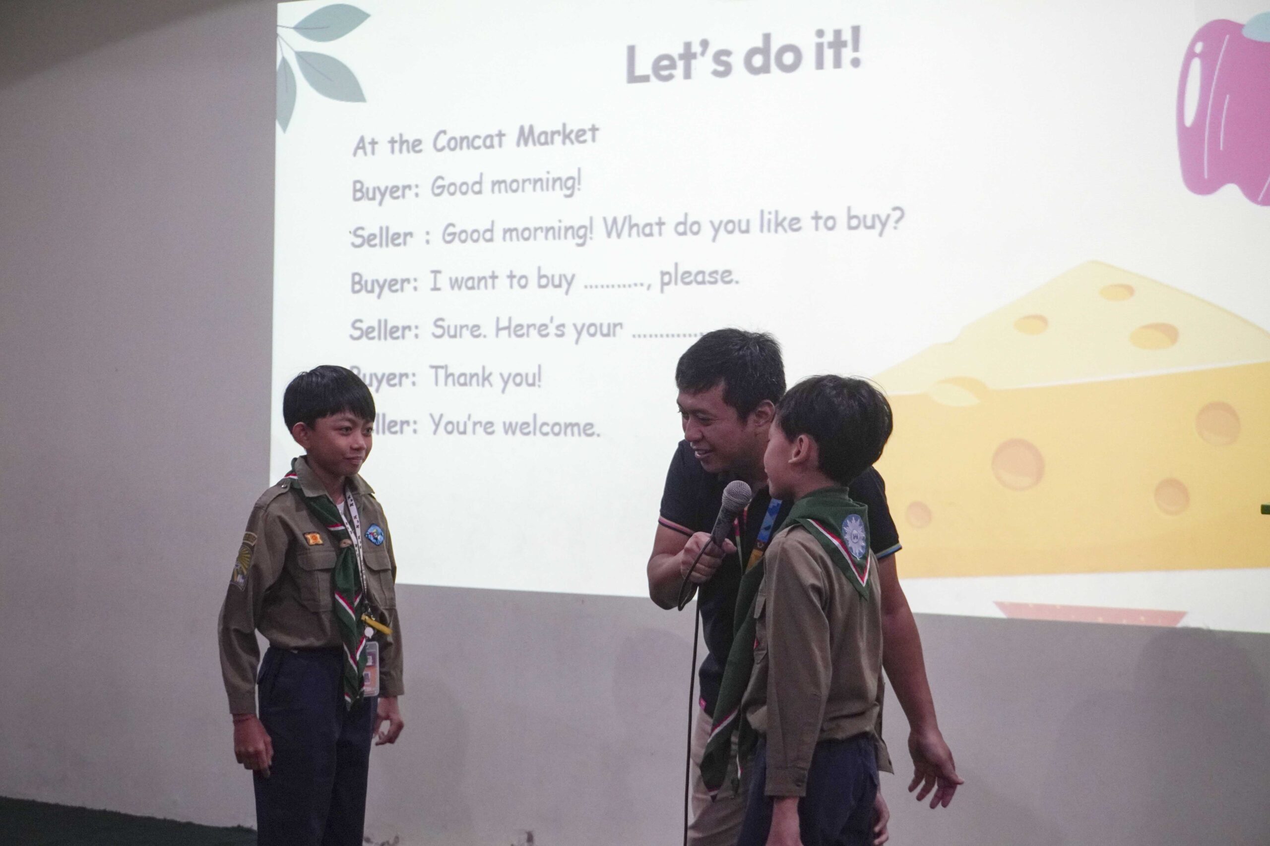 Dalam kegiatan ini, siswa belajar mengenalkan diri dan menyebutkan berbagai nama makanan dalam bahasa Inggris. Tidak hanya itu, mereka juga berlatih melakukan percakapan sederhana dengan teman sebaya. Suasana berlangsung meriah dan penuh semangat. Para guru mendampingi siswa dengan sabar, menciptakan suasana belajar yang menyenangkan.