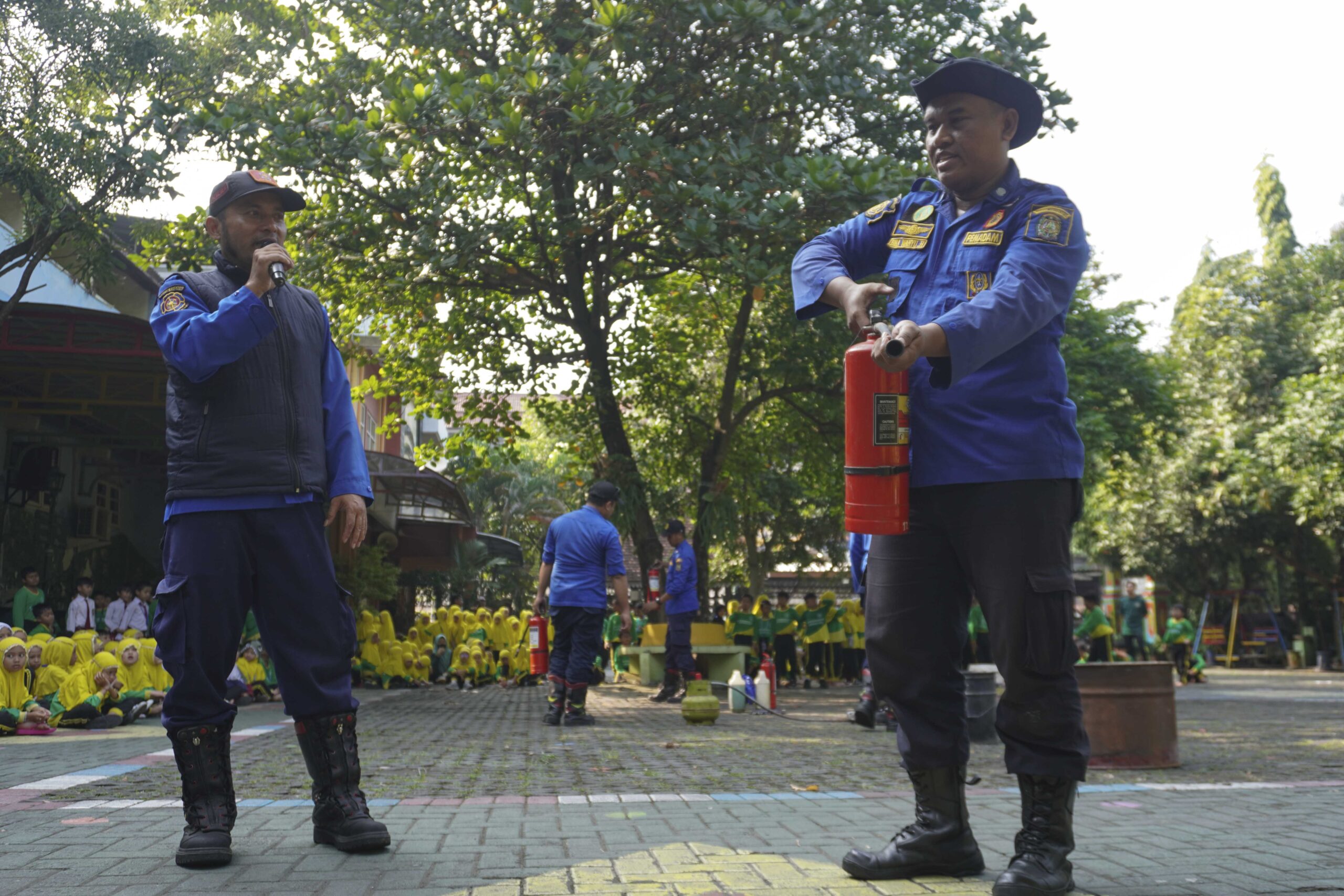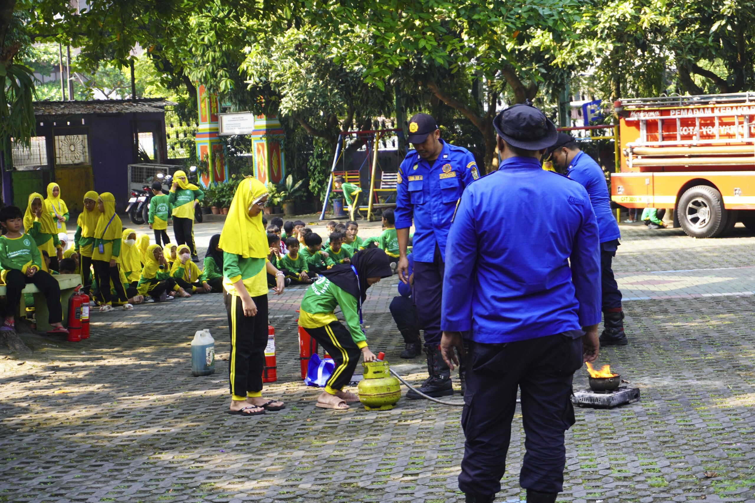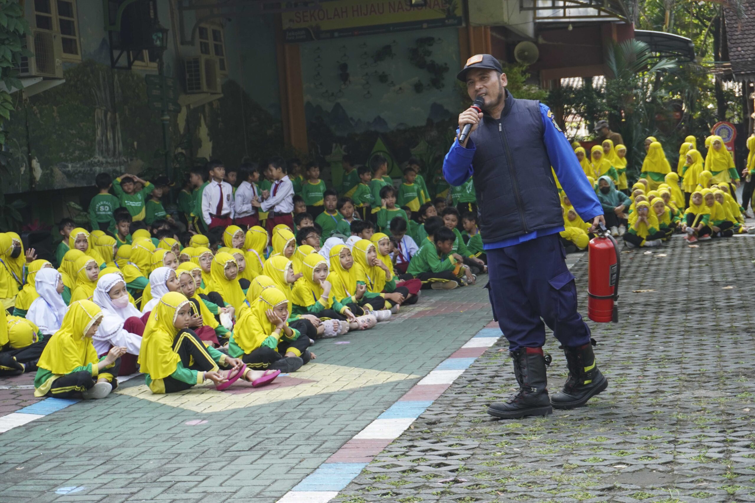 Setelah senam, kegiatan dilanjutkan dengan edukasi kebakaran yang bekerja sama dengan Dinas Pemadam Kebakaran Kota Yogyakarta. Tim Damkar yang dipimpin oleh Bapak Siswanto hadir langsung untuk memberikan sosialisasi kepada siswa, guru, dan karyawan mengenai bahaya kebakaran dan langkah-langkah awal penanggulangan yang dapat dilakukan.