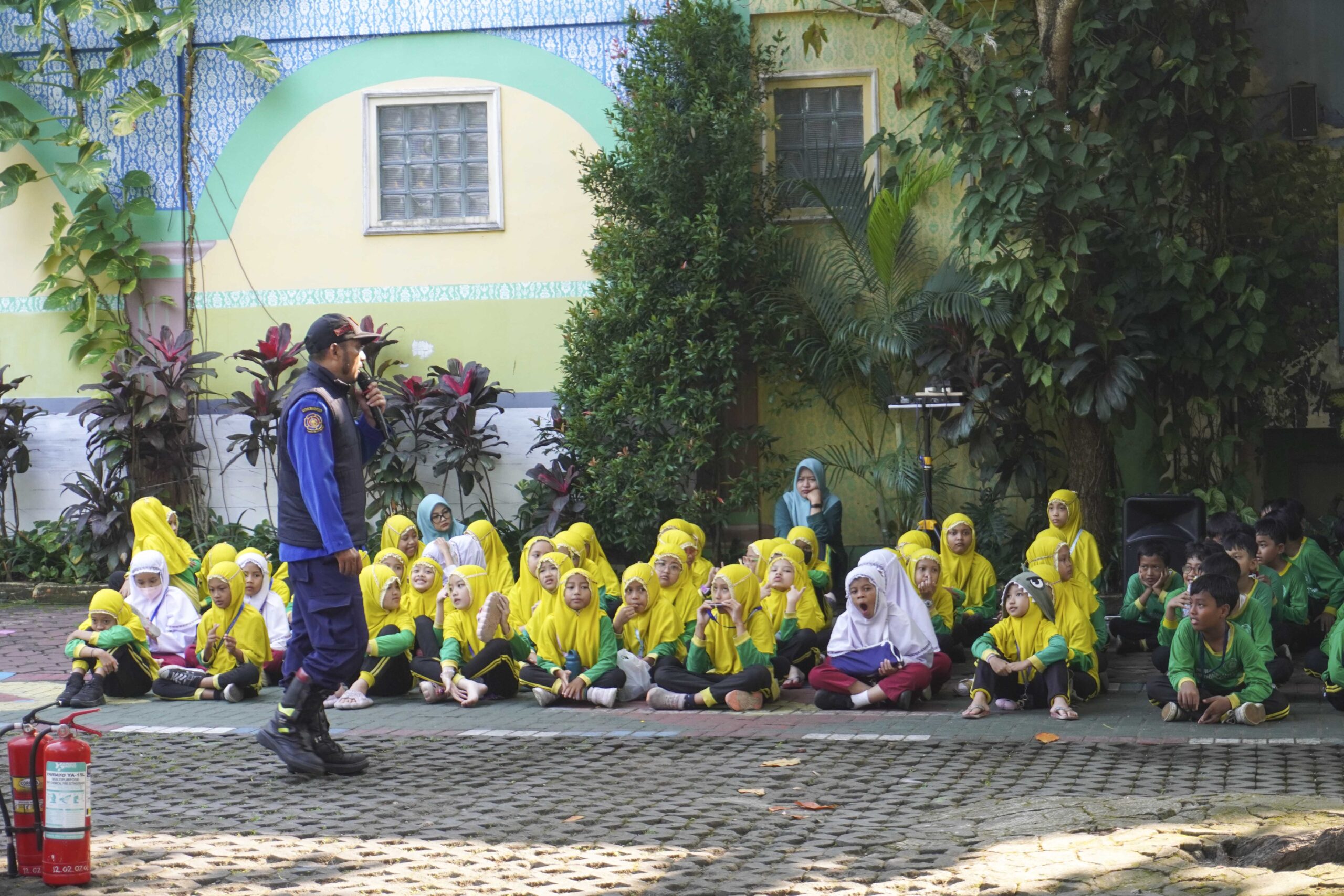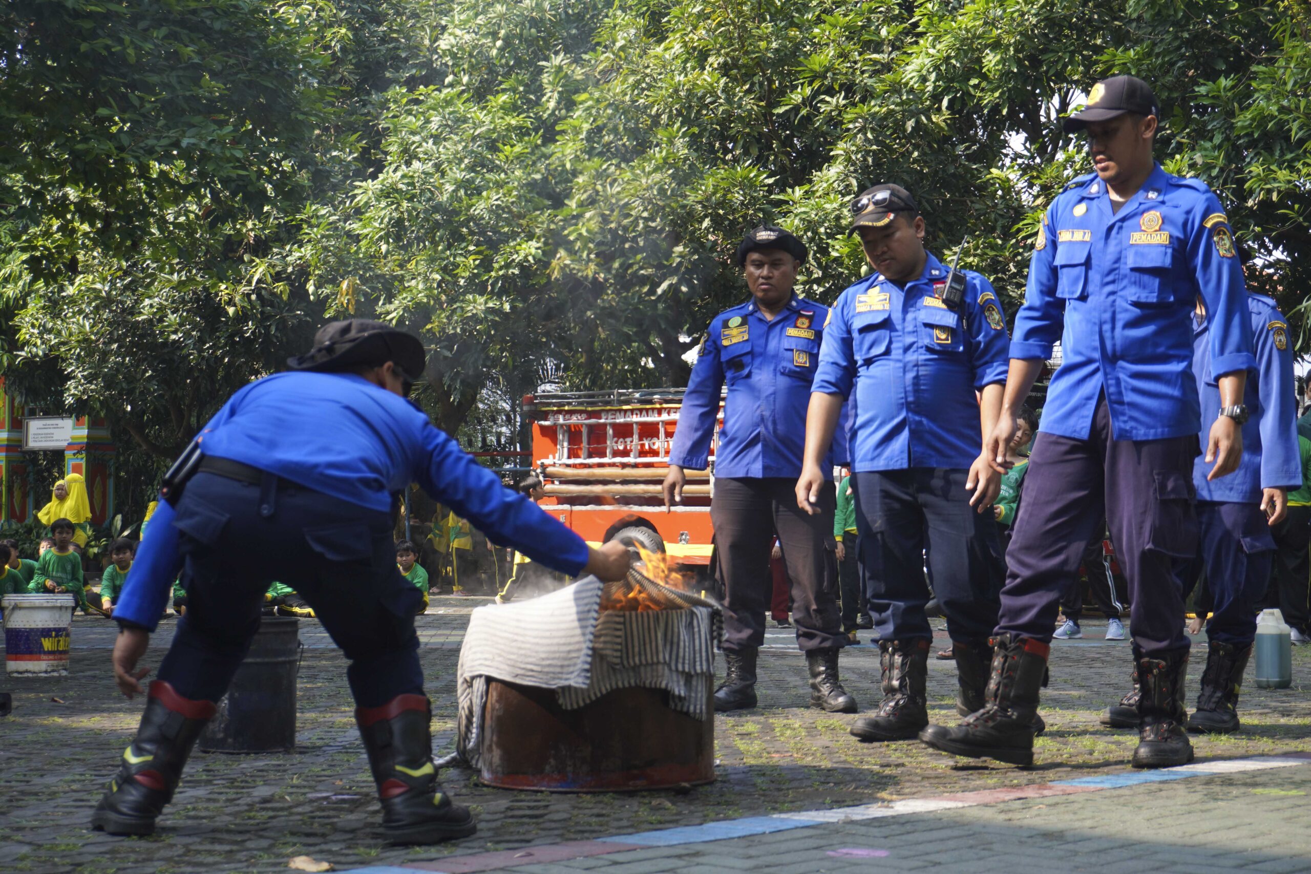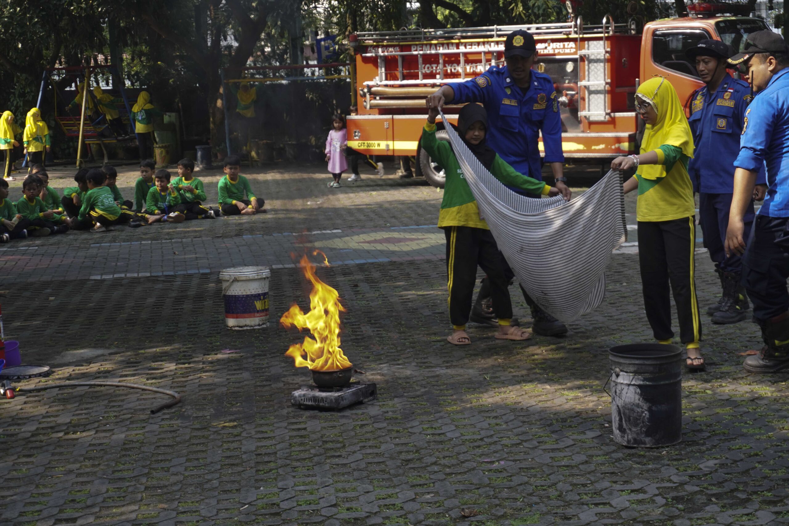 Setelah senam, kegiatan dilanjutkan dengan edukasi kebakaran yang bekerja sama dengan Dinas Pemadam Kebakaran Kota Yogyakarta. Tim Damkar yang dipimpin oleh Bapak Siswanto hadir langsung untuk memberikan sosialisasi kepada siswa, guru, dan karyawan mengenai bahaya kebakaran dan langkah-langkah awal penanggulangan yang dapat dilakukan.