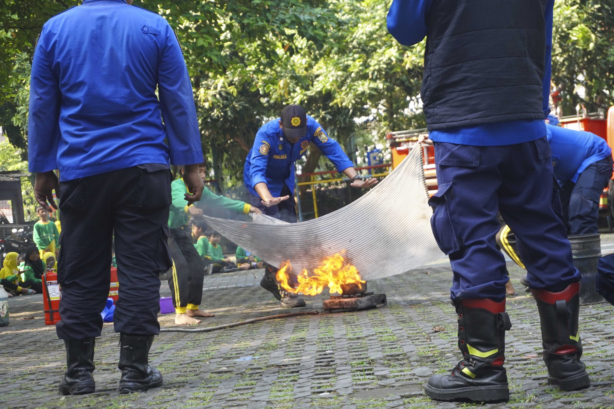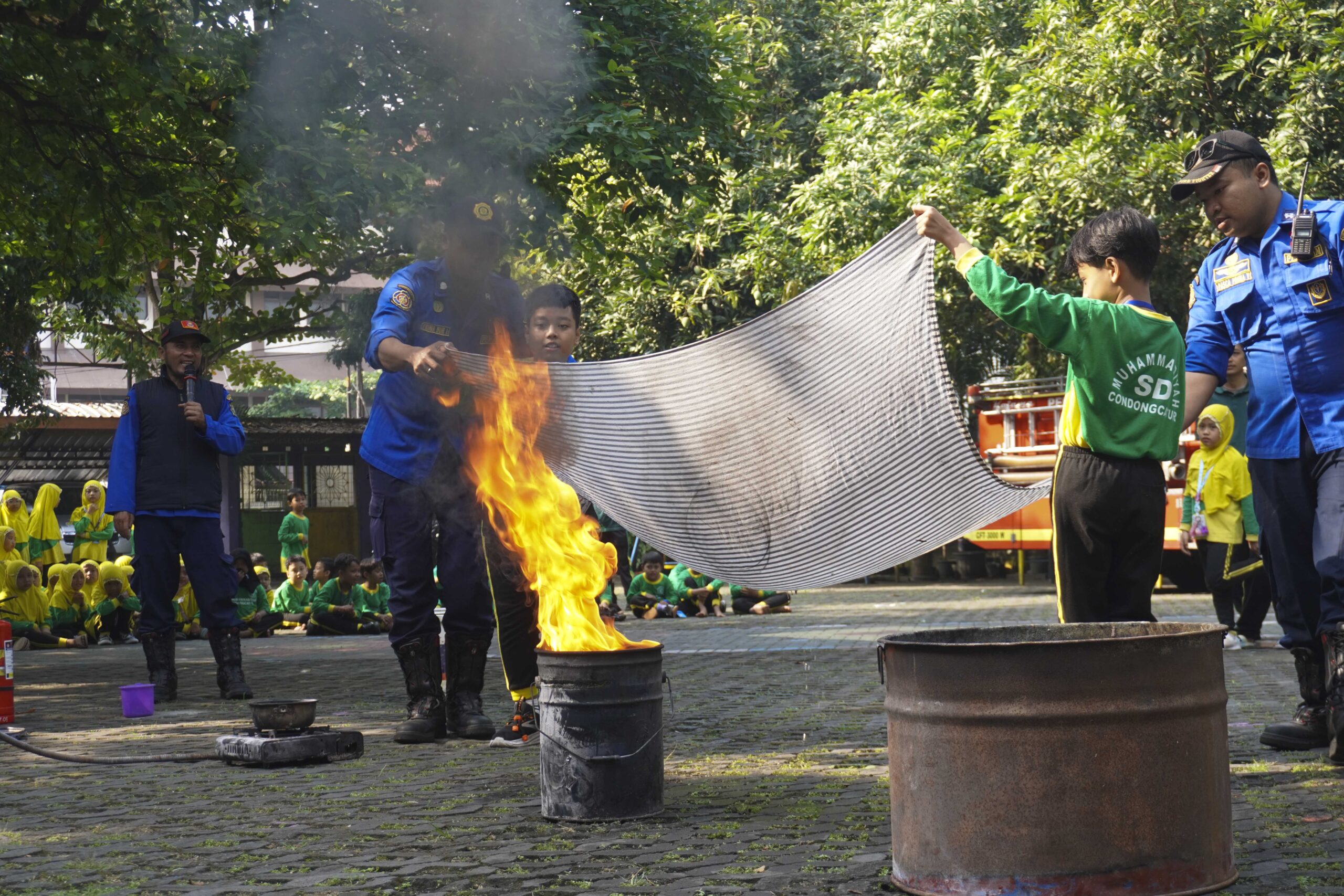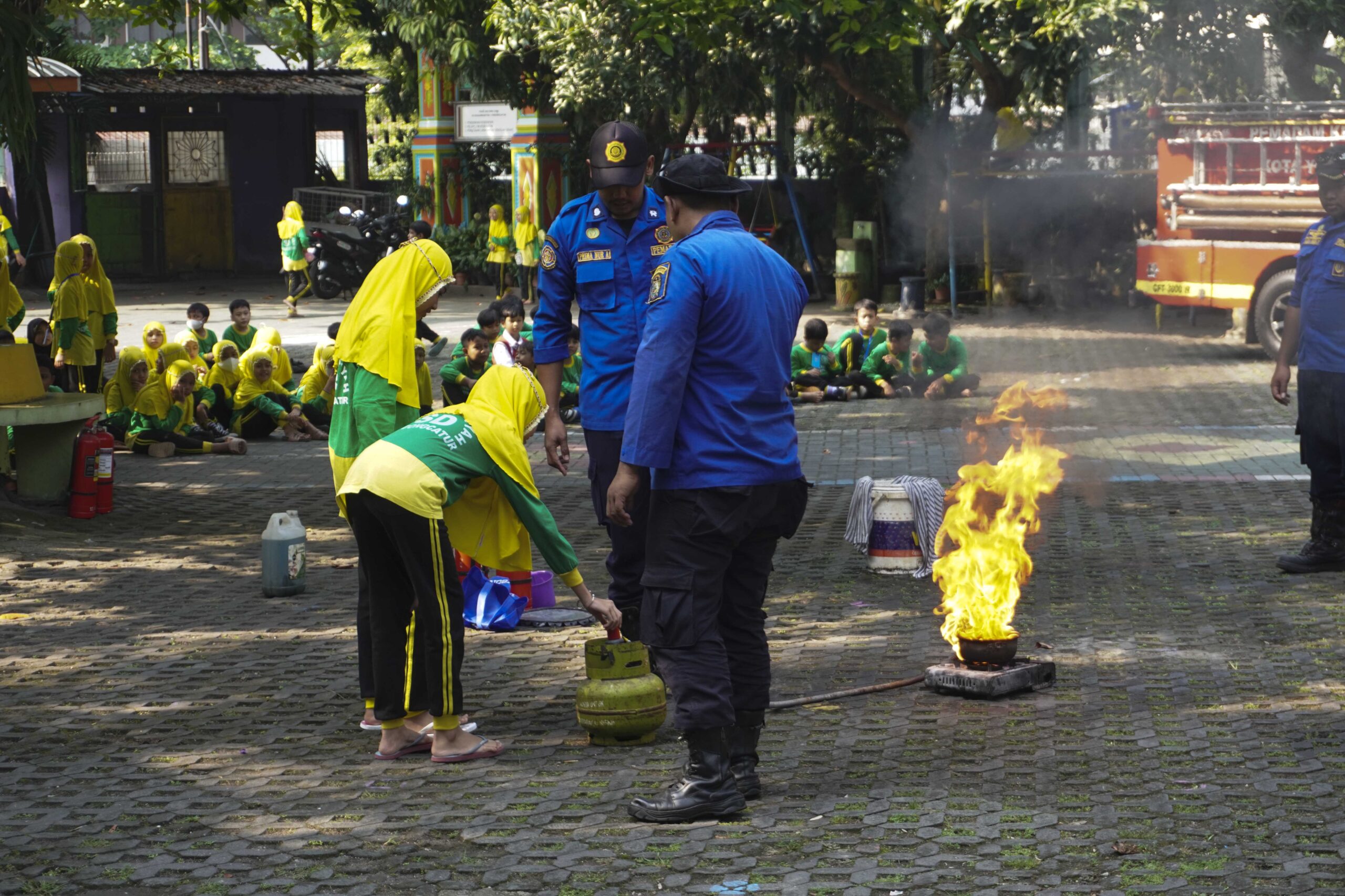 Siswa-siswa tampak antusias mengikuti penjelasan dan demonstrasi dari petugas Damkar. Mereka diperkenalkan pada berbagai metode penanganan awal kebakaran, seperti menggunakan Alat Pemadam Api Ringan (APAR) dan alat tradisional seperti karung goni basah, handuk, atau kain yang dibasahi air. Edukasi ini tidak hanya menambah wawasan anak-anak mengenai tugas mulia petugas pemadam kebakaran, tetapi juga memberikan keterampilan praktis dalam menghadapi kondisi darurat.