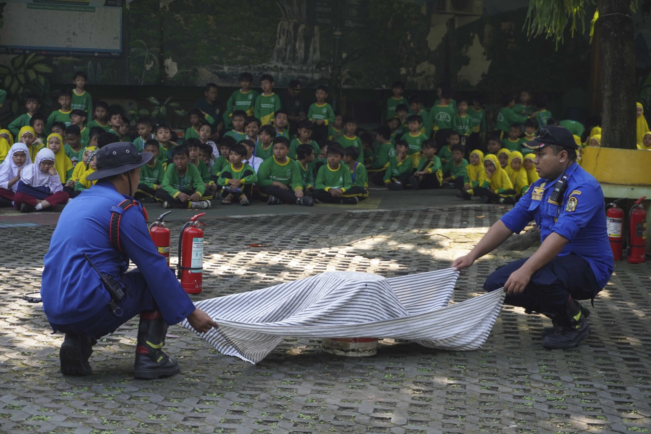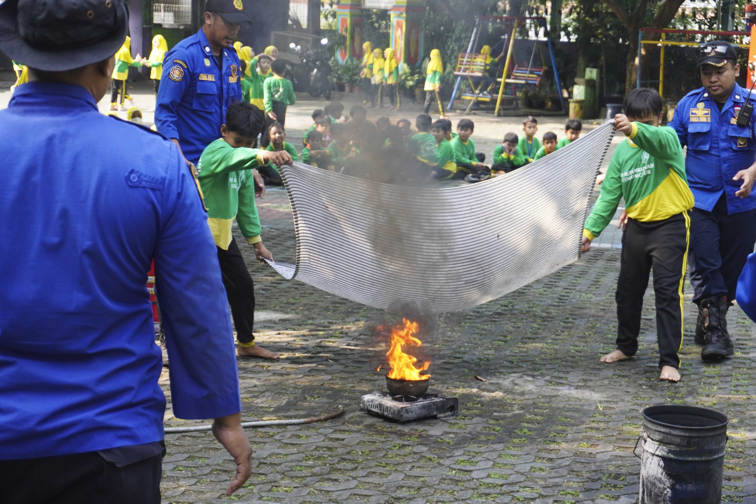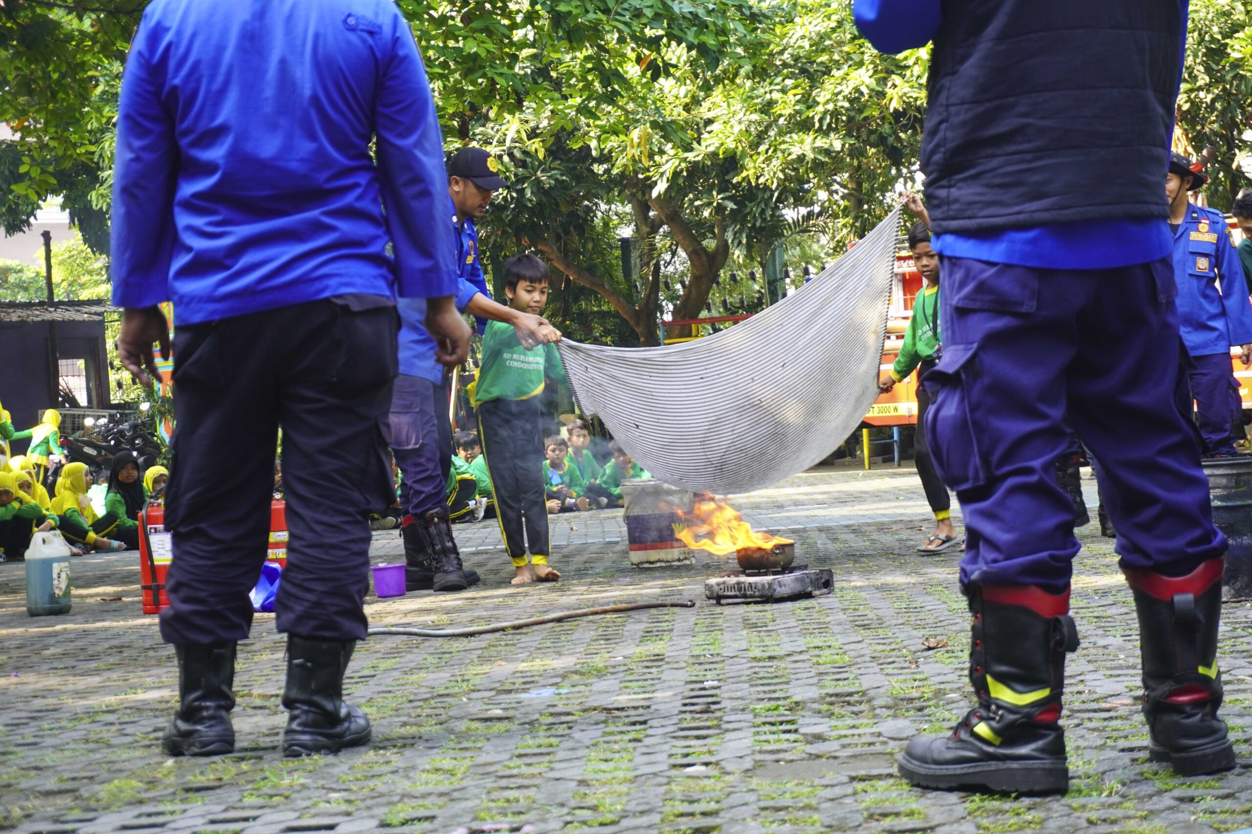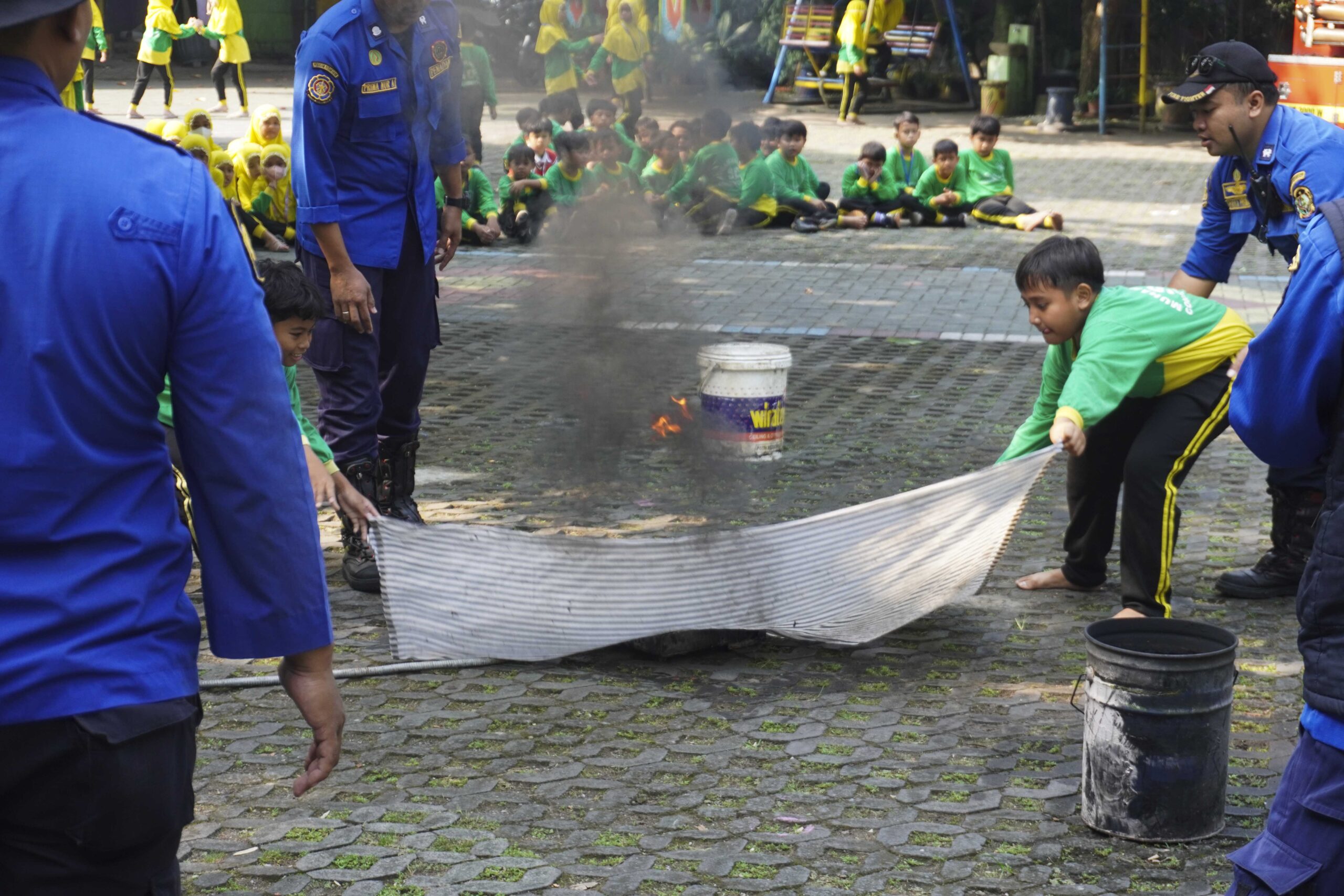 Siswa-siswa tampak antusias mengikuti penjelasan dan demonstrasi dari petugas Damkar. Mereka diperkenalkan pada berbagai metode penanganan awal kebakaran, seperti menggunakan Alat Pemadam Api Ringan (APAR) dan alat tradisional seperti karung goni basah, handuk, atau kain yang dibasahi air. Edukasi ini tidak hanya menambah wawasan anak-anak mengenai tugas mulia petugas pemadam kebakaran, tetapi juga memberikan keterampilan praktis dalam menghadapi kondisi darurat.