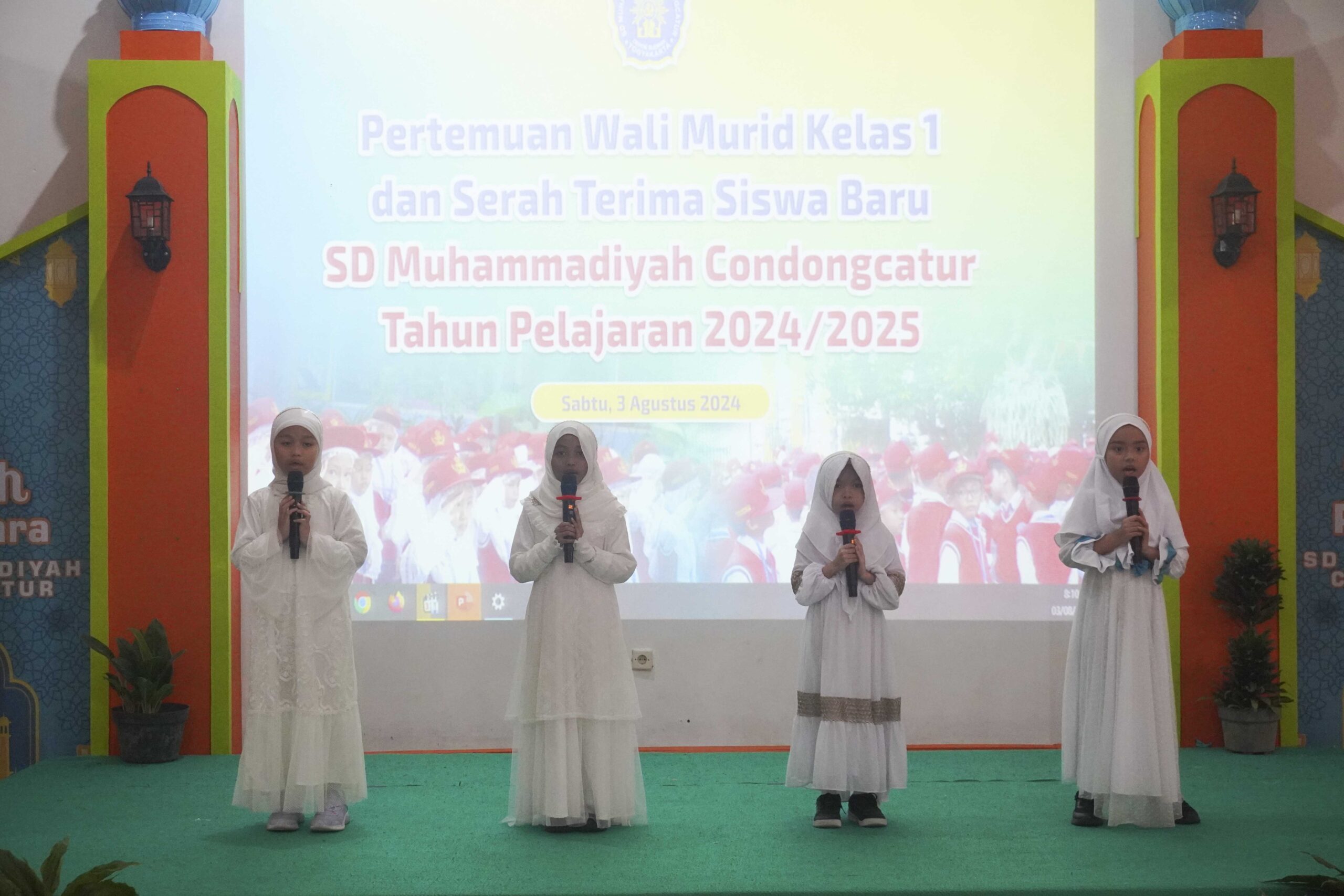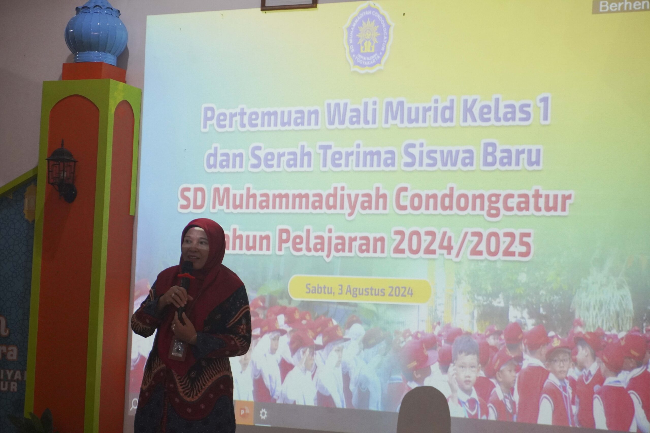 SD Muhammadiyah Condongcatur menggelar pertemuan wali siswa kelas 1 tahun pelajaran 2024/2025 untuk pertama kalinya. Kegiatan ini dilaksanakan pada Sabtu, 3 Agustus 2024. Pihak sekolah menyelenggarakan kegiatan ini sebagai bentuk komunikasi antara sekolah dengan orang tua/wali siswa baru. Pertemuan ini dilaksanakan di Aula K.H. Ahmad Dahlan SD Muhammadiyah Condongcatur. Kegiatan ini dihadiri oleh Kepala Sekolah, Bapak/Ibu Wakil Kepala Sekolah, Bapak/Ibu Guru kelas 1 serta orang tua/wali siswa kelas 1. Turut hadir Bapak Drs. H. Sayuti Mustofa, M.Pd selaku Ketua Majelis Dikdasmen PNF PCM Depok.